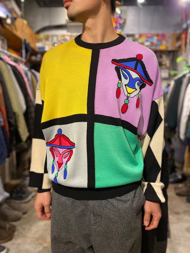 謎の総柄ニット 2xlで大きめでガッシリした作りです モードに合わすのもよし size 2XL表記 肩幅52cm 袖丈67cm 身幅59cm 着丈74cm 商品状態 A S・・・新品未使用/デッドストック A・・・使用感などもあまり無く比較的綺麗な状態 B・・・使用感はあるが目立ったダメージや汚れが見られない状態(通常の古着の状態) C・・・使用感がやや強いor部分的に目立ったダメージや汚れがある状態 D・・・全体的に状態が悪いが使用するには問題はない状態 あくまでも主観での基準になりますがご参照下さい。 --- 古着商品の場合、使用感・ヨゴレ等ある場合があります。 写真に掲載もしておりますがご理解の上お願い致します。 キャンセル・返品・交換はできません。