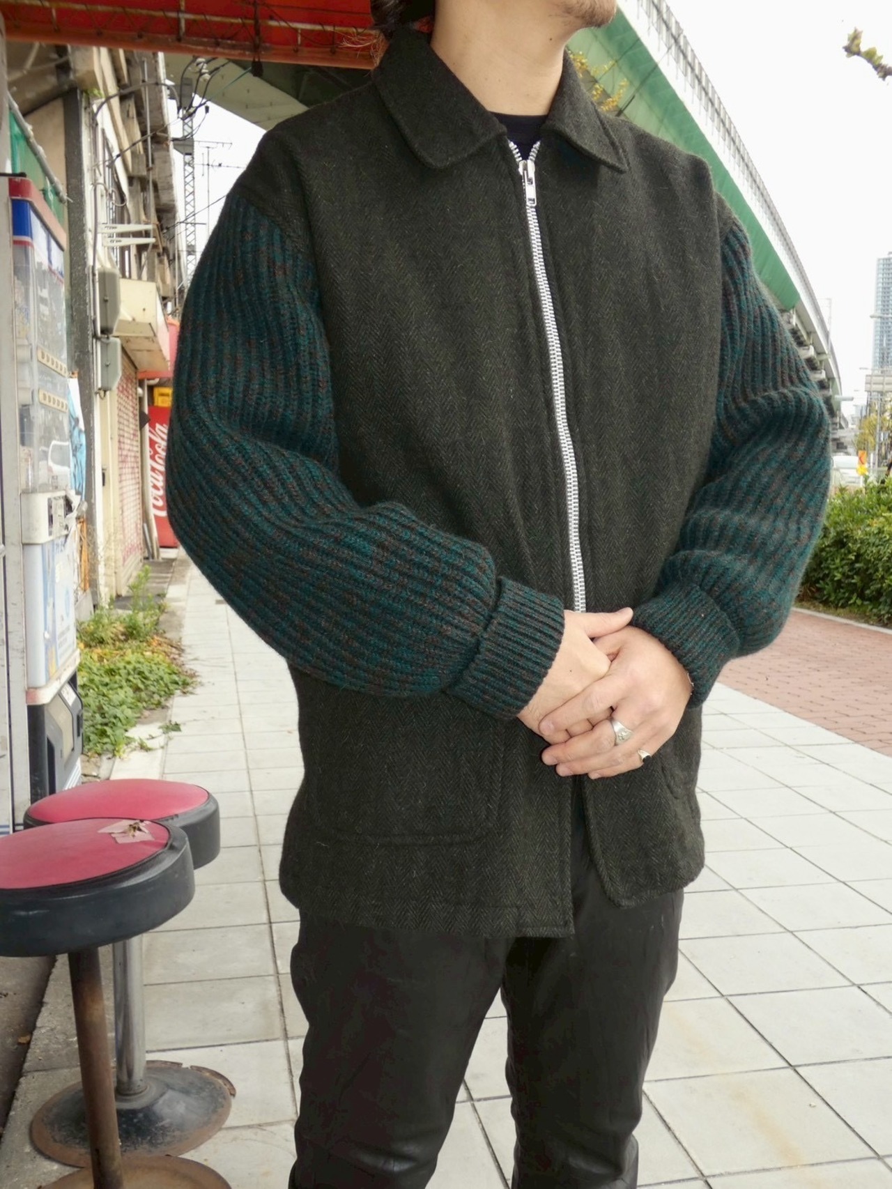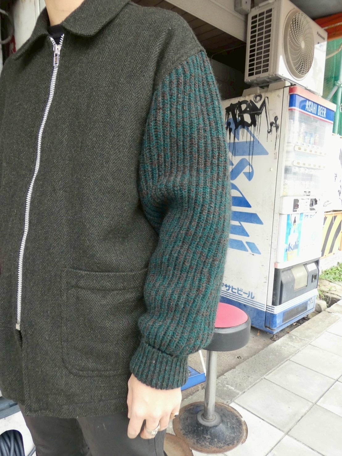ヘリンボーンのアクリルウールボディにニット袖のドッキング