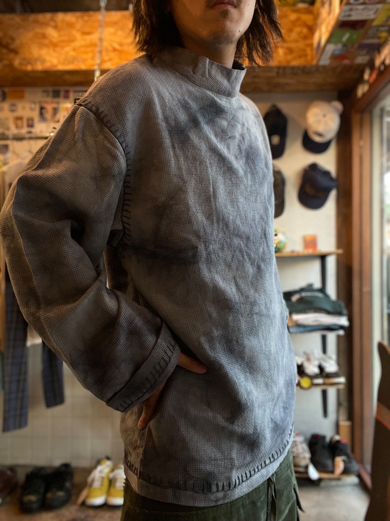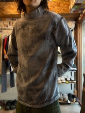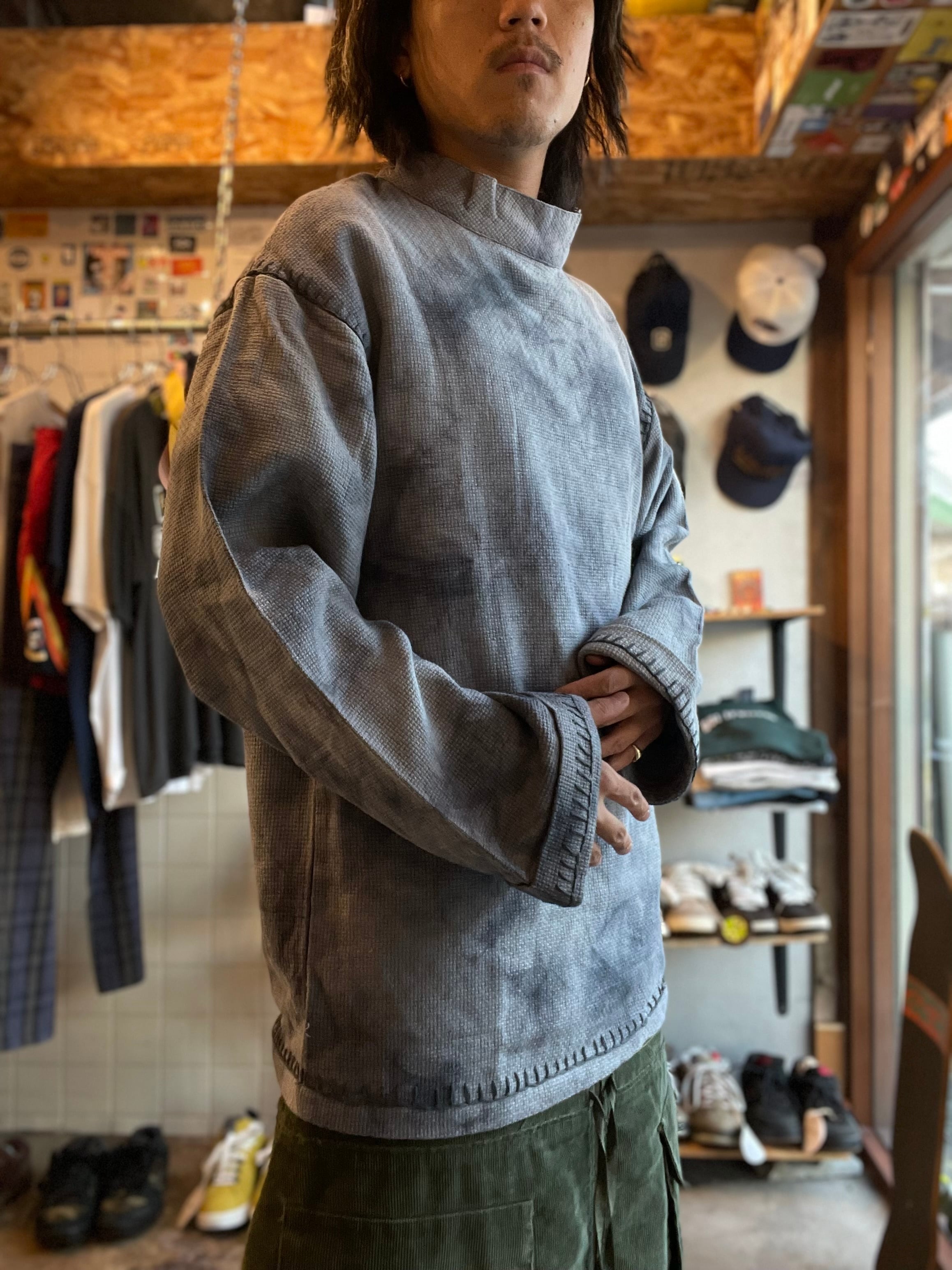 コットンニットのタイダイでユーロワークであるようなモックネック、ステッチの入り方とこのサイズ感